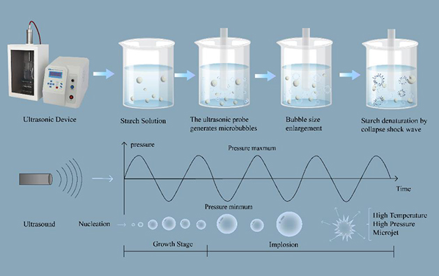 超聲波輔助淀粉改性是一種新興的綠色物理方法,它利用空化效應(yīng)和機(jī)械剪切作用破壞淀粉的結(jié)晶區(qū)域,改變顆粒形態(tài),增加比表面積,從而有效提升淀粉的溶解性、親水性和功能特性。相比傳統(tǒng)的化學(xué)和酶法改性方式,超聲波改性避免了化學(xué)試劑的使用及生物催化劑的殘留,更安全且環(huán)保。?