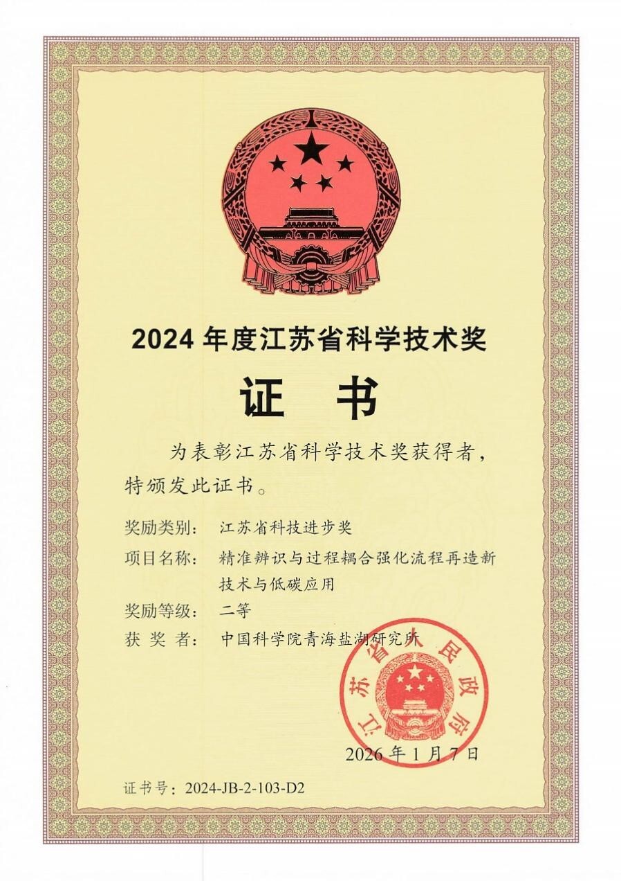 近日,江蘇省人民政府發(fā)布《關(guān)于2024年度江蘇省科學(xué)技術(shù)獎(jiǎng)勵(lì)的決定》(蘇政發(fā)〔2026〕2號(hào)),由中國(guó)科學(xué)院青海鹽湖研究所作為第二完成單位參與完成的“精準(zhǔn)辨識(shí)與過程耦合強(qiáng)化流程再造新技術(shù)與低碳應(yīng)用”項(xiàng)目,榮獲2024年度江蘇省科技進(jìn)步二等獎(jiǎng)。
